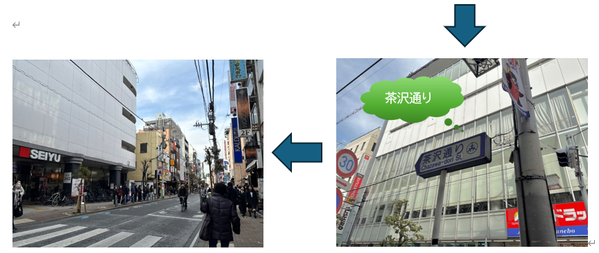曲がって茶沢通りの看板が見えたら、ずっと真っすぐです!
